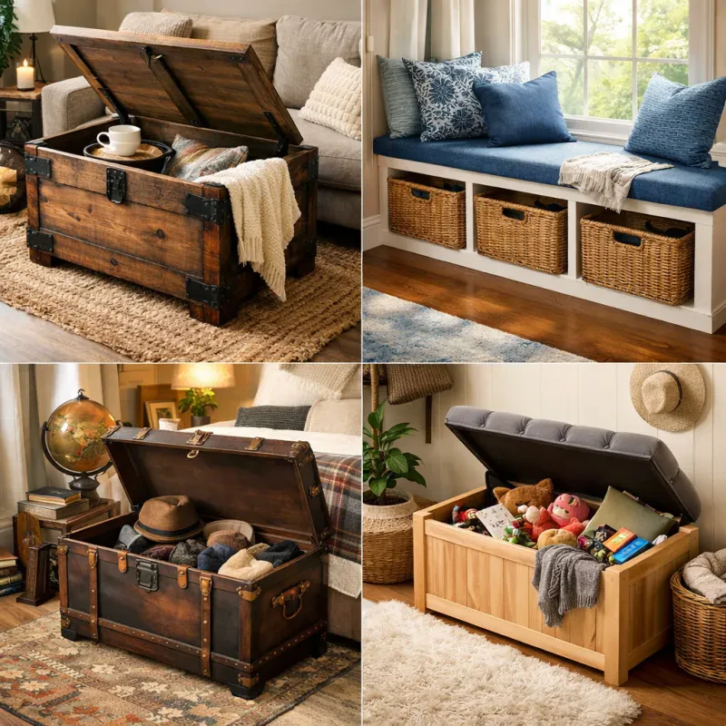 Consider a faux leather trunk for a chic, contemporary vibe. It adds a touch of sophistication and looks great at the foot of your bed or as a coffee table in the living room. If you love the charm of rustic decor, you might prefer a wooden trunk with an aged finish. These trunks not only store your items but also tell a story and can be a memorable focal point in any room.